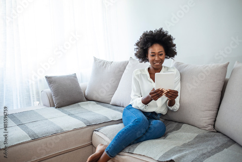 A beautiful African woman on a beige couch at home and shopping online, so comfortable and modern white clothes, denim pants, such a beautiful light interior design. The concept of online shopping