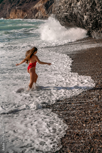 A beautiful and sexy brunette in a red swimsuit on a pebble beach, Running along the shore in the foam of the waves