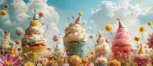 A beautiful and whimsical landscape filled with giant cupcakes, lollipops, and other sweet treats