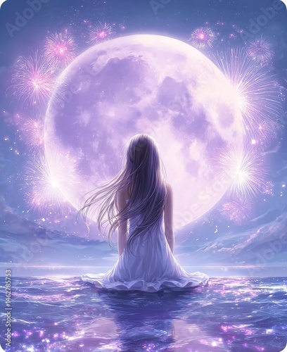 A beautiful anime girl with long hair sits on the moon, surrounded by sparkling stars and colorful