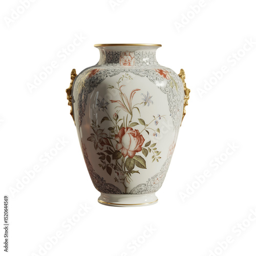 A beautiful antique vase adorned with delicate floral patterns stands on transparent background
