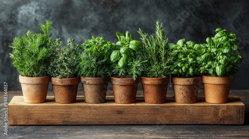 A beautiful arrangement of fresh herbs in terracotta pots on a wooden tray, showcasing vibrant greens and adding a touch of nature to any space.