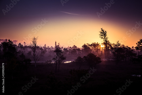 A beautiful, artistic, colorful morning landscape of a North European swamp