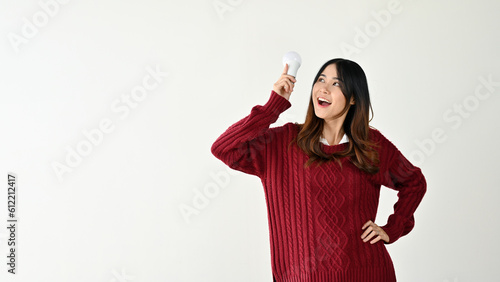 A beautiful Asian female holding a light bulb, copy space on an isolated white background