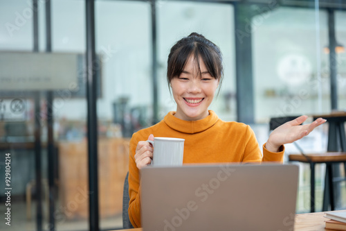 A beautiful Asian woman is working remotely from a cafe, having an online meeting with her team.