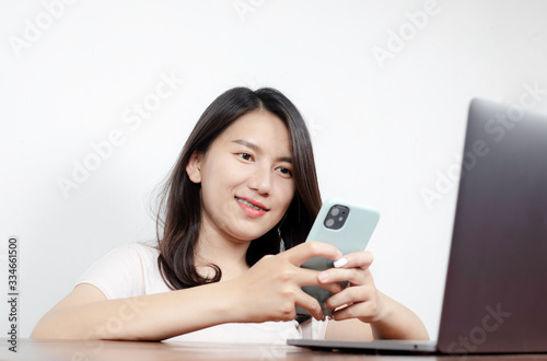A beautiful Asian woman talking on the phone while sipping coffee.