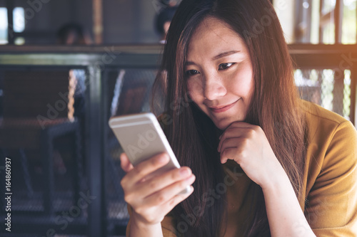 A beautiful Asian woman with smiley face using and looking at smart phone in modern cafe