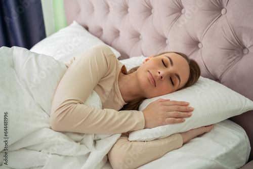 A beautiful attractive woman sleeps and has a sweet dream, lying on a bed in a cozy bedroom and feeling so relaxed and comfortable
