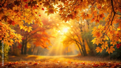 A beautiful autumnal tapestry featuring vibrant foliage, golden sunlight, fallen leaves, and warm tones. Nostalgic and picturesque