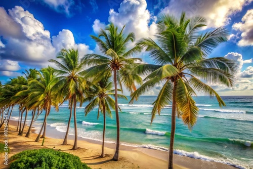 A beautiful beach scene with palm trees and a clear blue sky