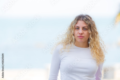 a beautiful blonde girl with long curly hair and a white shirt with a very blurry and white background
