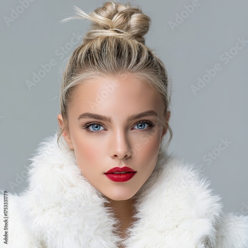 a beautiful blonde woman with blue eyes and red lipstick, wearing a white fur coat, looking at the camera