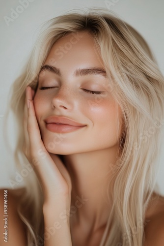 a beautiful blonde woman with her eyes closed, smiling and touching her face. the background is white, creating an atmosphere suitable for beauty advertising.