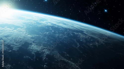 A beautiful blue planet with a bright sun in the background. The planet is surrounded by a vast expanse of stars, creating a serene and peaceful atmosphere