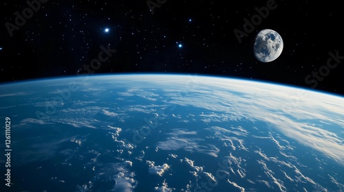 A beautiful blue planet with a large moon in the sky. The moon is positioned above the planet, and the stars are scattered throughout the sky. Concept of wonder and awe