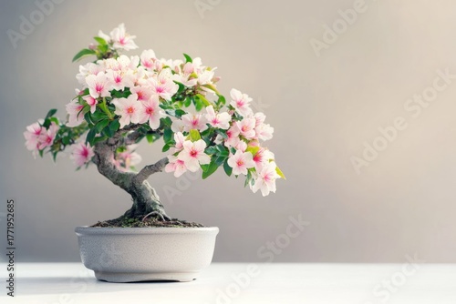 A beautiful bonsai tree with delicate pink and white flowers blooms gracefully in a grey pot against a soft, serene background.