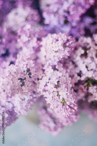 A beautiful bouquet of fresh purple lilacs in a glass vase