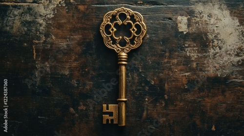 A beautiful bronze key with intricate details placed on a rustic wooden surface, lit from above