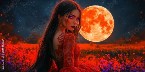 A beautiful brunette witch with violet eyes stands in a field of blood-red flowers at night. A glowing blood-red moon illuminates the mysterious atmosphere around her.