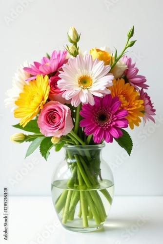 A beautiful bunch of assorted flowers in a glass vase on a white background, white background, decoration