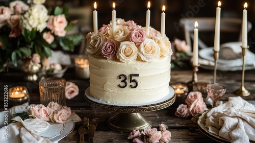 A beautiful cake with "35" candles, a white frosting base, and a cascade of edible roses, sitting on a vintage-style cake stand.