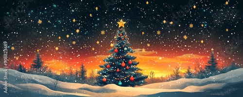 A beautiful Christmas tree adorned with colorful ornaments, set against a glowing sunset and falling snowflakes.