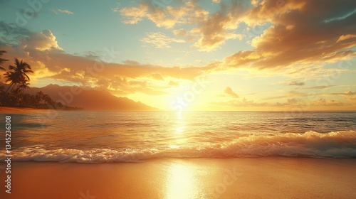 A beautiful coastal beach sunset featuring calm ocean water and sky