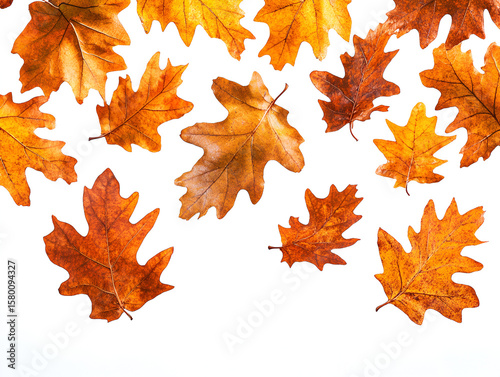 A beautiful collection of colorful orange, yellow, and brown autumn oak leaves scattered on a white background.