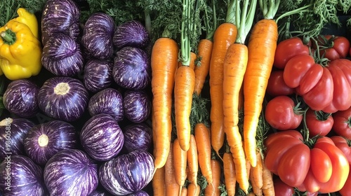 A beautiful display of heirloom vegetables, including striped tomatoes and purple carrots, arranged in a colorful assortment