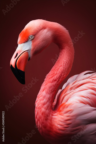 A beautiful exotic bird, a long-necked pink flamingo standing proudly in the water on a pink background. Generative ai
