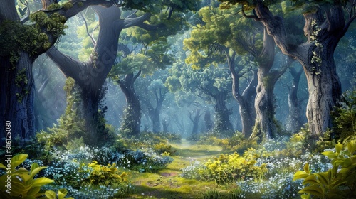 A beautiful fairytale enchanted forest with big trees and great vegetation. Digital painting background hyper realistic