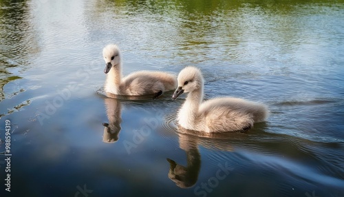A beautiful family of swans swims gracefully in the lake. Bask in the soft sunlight With the greenery reflecting from their fur. The focus is on the face and body of the baby white swan.