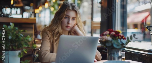 a beautiful female sitting near a table in a coffee shop while doing ecommerce on a computer during free time. generative AI