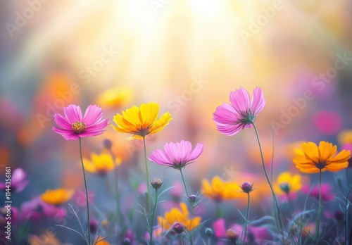A Beautiful Field of Colorful Cosmos Flowers Bathed in Warm Sunshine Creating a Serene and Enchanting Atmosphere of Nature's Splendor