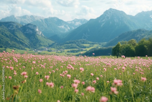 A beautiful field of pink flowers with mountains in the background, perfect for travel or nature-themed projects