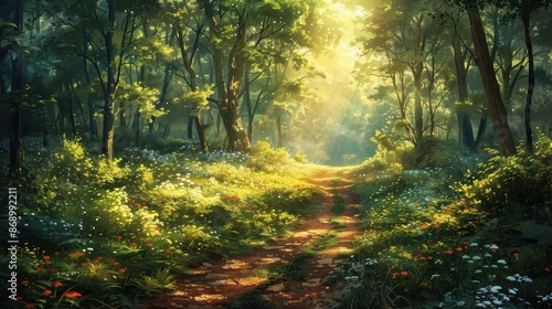 A beautiful forest path, with long overgrown plants and flowers on both sides.