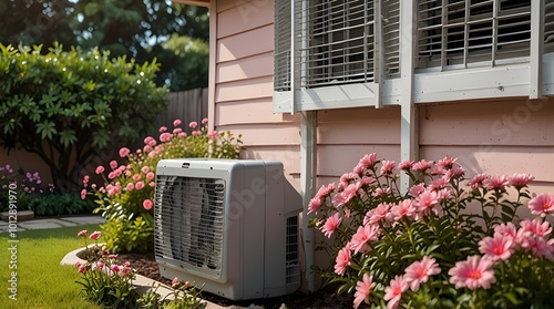 A beautiful garden with pink flowers and white air conditioner. The flowers are in full bloom and the air conditioner is placed in the background. The garden is a peaceful place. genertive.ai