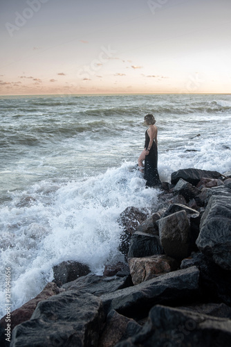 A beautiful girl in a long black dress stands on a stone in the sea waves at sunset.
