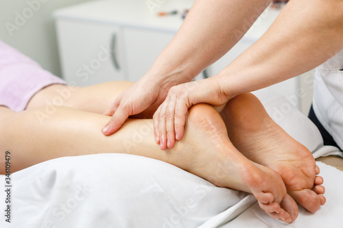 A beautiful girl lies on a massage table and she gets a massage that she enjoys in the massage room