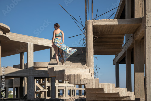 A beautiful girl stands on an abandoned building. Young girl. Colorful photo. Blue sky. Old abandoned building.