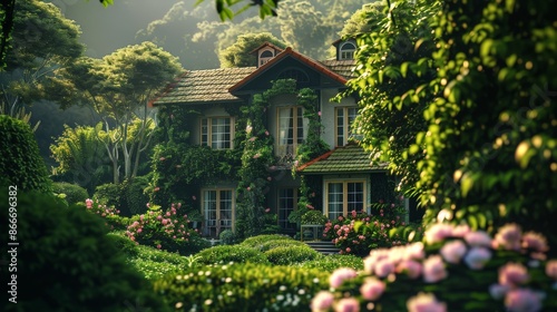 A beautiful house surrounded by lush greenery and blooming flowers.