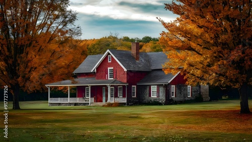 A beautiful house with an autumn landscape trees and open field