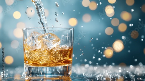 A beautiful image featuring whiskey being poured into a glass as water droplets capture light, creating an artistic feel that highlights the drink's rich hues.