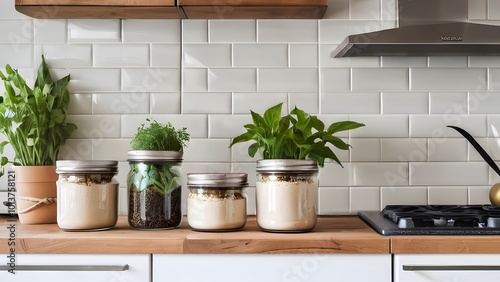 A beautiful kitchen with eco-friendly decor, showcasing reusable containers, plants, and organic ingredients, promoting a sustainable lifestyle.
