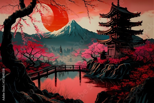 A beautiful landscape illustration, Japanese Style, Dramatic. Generative AI