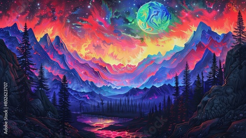 A beautiful landscape painting of a mountain range at sunset. The sky is a vibrant mix of oranges, pinks, and purples, and the mountains are a deep blue. The foreground is a lush forest, and a river r