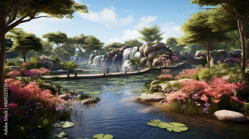 A beautiful landscape with a waterfall, a river, and a bridge. The water is crystal clear. The trees are lush and green. The flowers are in bloom.