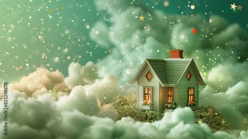 A beautiful little house with a backdrop of soft green artificial clouds and a sprinkling of small, colorful stars, evoking a peaceful, enchanted feeling.