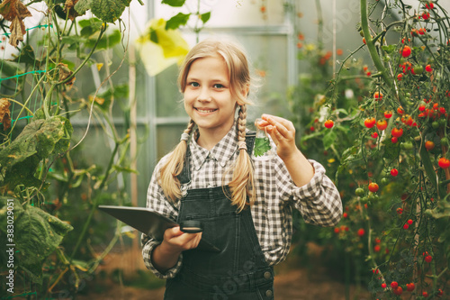 A beautiful little teenage girl with a tablet in her hands examines a sample of a plant through a magnifying glass. Curious children. Organic pure products
