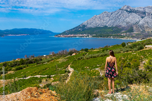 a beautiful long-haired girl in a black summer dress stands on top of a mountain overlooking a paradisiacal Croatian bay and the mighty green mountains in the background; vacation in croatia on the pe
